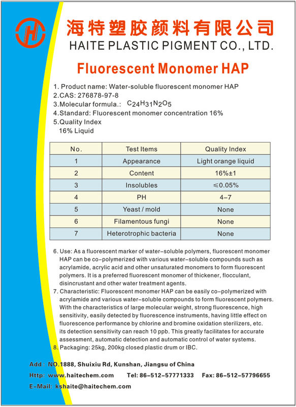 HAPNQ es líquido marrón con la concentración del 16% y agua del 84%. Cuando están utilizadas en circuitos de agua industriales, las señales fluorescentes de este los polímeros marcados con etiqueta se pueden utilizar para determinar cuántos polímeros marcados con etiqueta están presentes en circuitos de agua industriales.